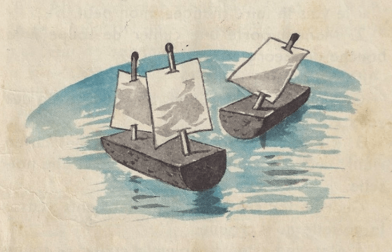 4. Bien vite, Maman confectionne deux petits bateaux avec des morceaux de bouchon et des bouts d’allumette. Georgie souffle doucement et les petits bateaux marchent.