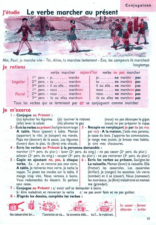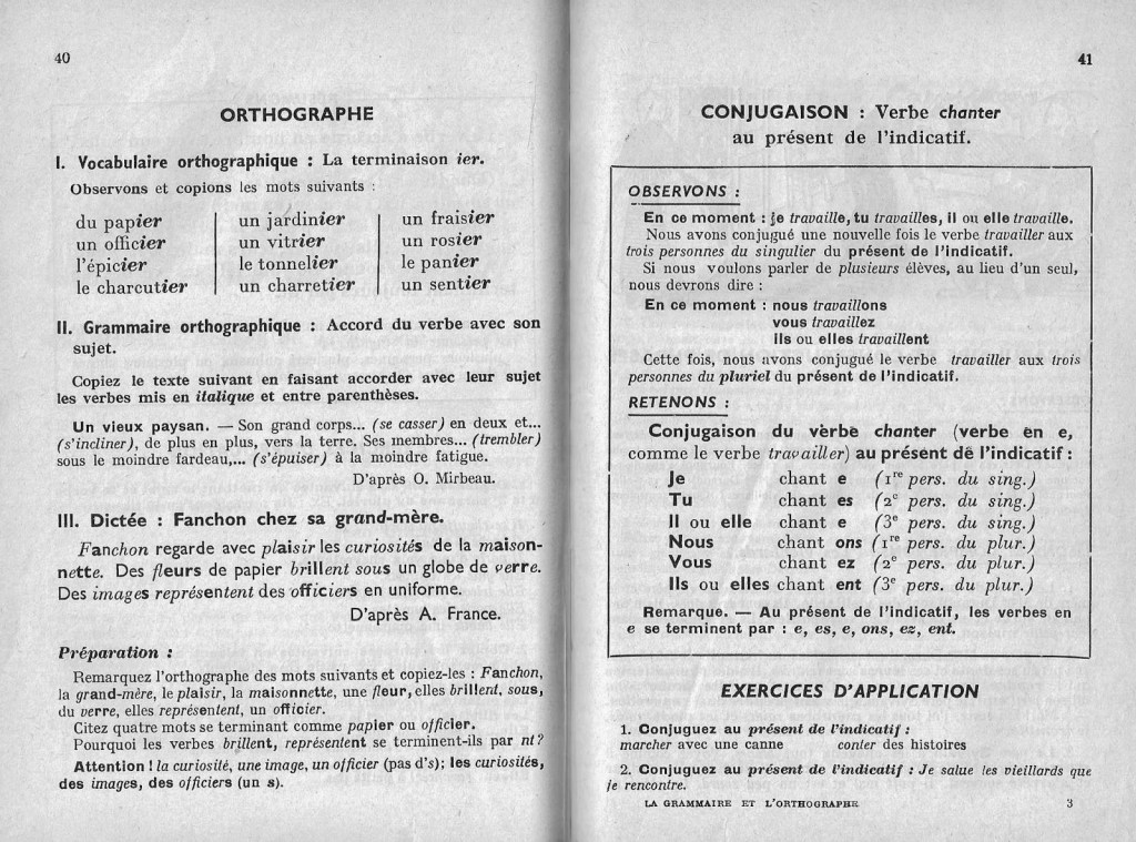 Face à ce dédale de règles et de petits détails qui nécessitent une attention précise, la solution des anciens manuels est un apprentissage progressif basé sur le par coeur. Dans ce premier livre de grammaire par exemple (niveau CP-CE1), les verbes sont présentés les uns après les autres : le verbe « chanter » au présent, à l’imparfait, au futur, idem pour finir, être et avoir.