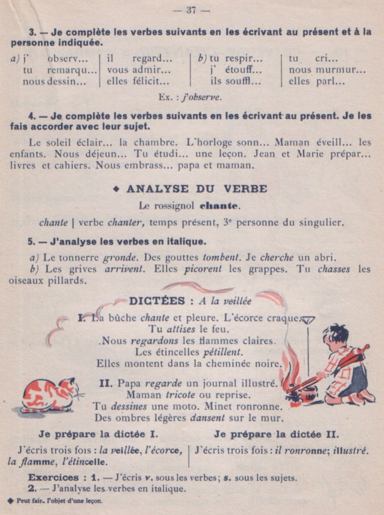Pourtant, les manuels à l’ancienne, s’ils font une large place aux lignes de conjugaison, ne s’arrêtent pas là. Leurs auteurs ont parfaitement conscience que le verbe doit être utilisé et manipulé au coeur de la phrase pour être parfaitement su.