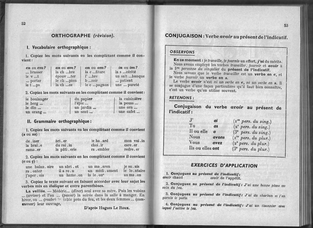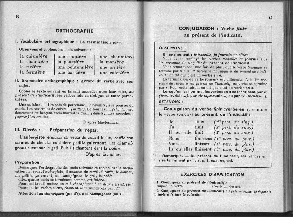 Dans cet autre manuel paru en 1954 (15e édition), les verbes sont appris par la terminaison au présent (les verbes en « e » ou les verbes en « s ») non par leur morphologie à l’indicatif.