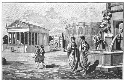 Voici une place d’une ville. Vous y voyez de beaux monuments à colonnes. Une fontaine verse son eau nuit et jour. Cette ville est une ville gauloise. Vous devez être étonnés de voir une si belle ville en Gaule, car vous avez vu l’autre jour une maison gauloise bien misérable.