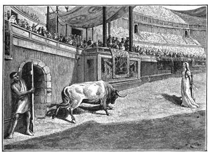 Elle fut condamnée à mort, et on la conduisit dans un cirque. Il y avait alors dans les villes des cirques bâtis en pierre, où se donnaient les spectacles. Les cirques étaient très grands. Des milliers de personnes s’y asseyaient sur des gradins de pierre.