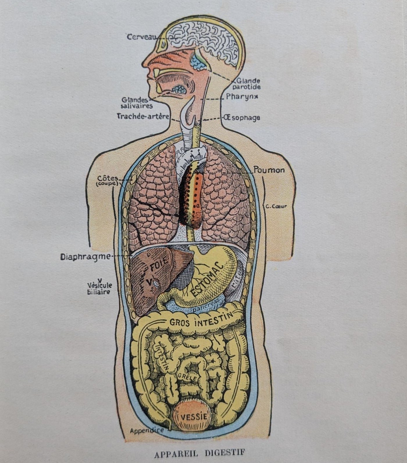 L’estomac est une grande poche élastique qui a la forme d’un biniou1. Il presse la pâte, qui devient peu à peu une sorte de bouillie blanche.